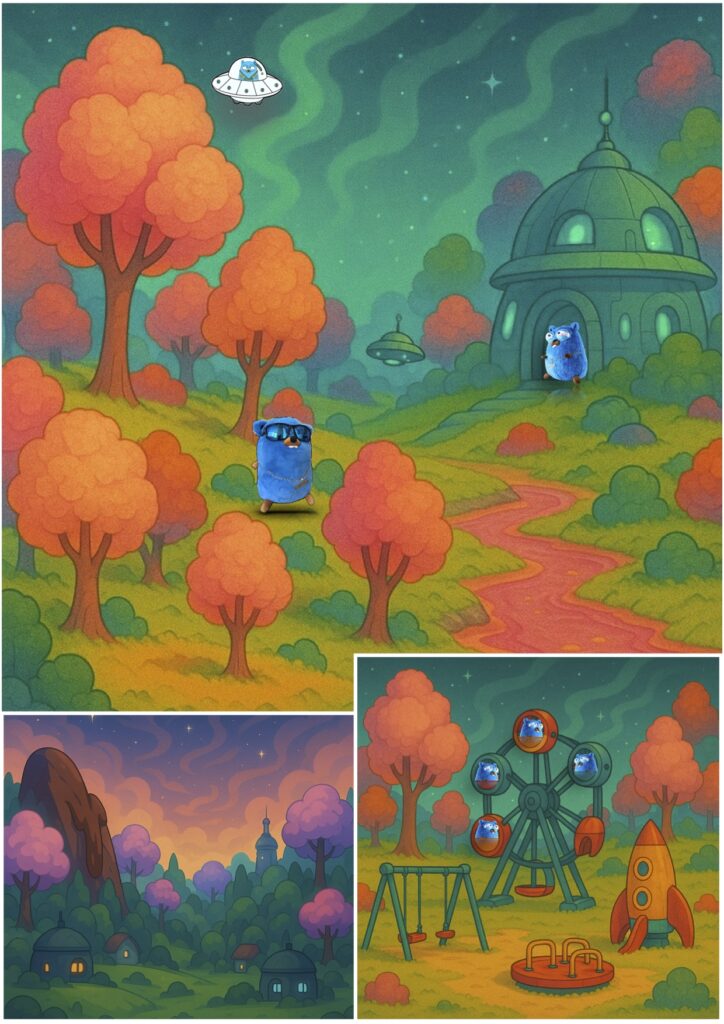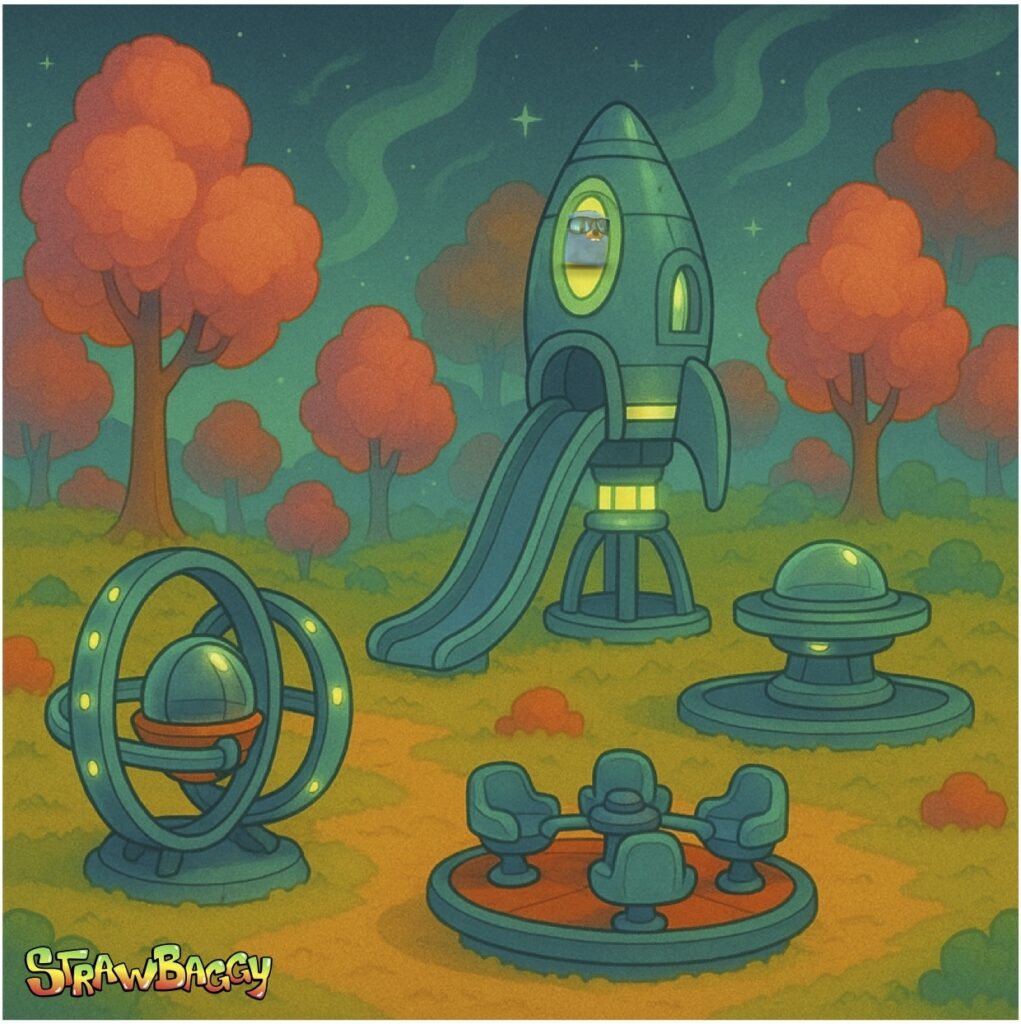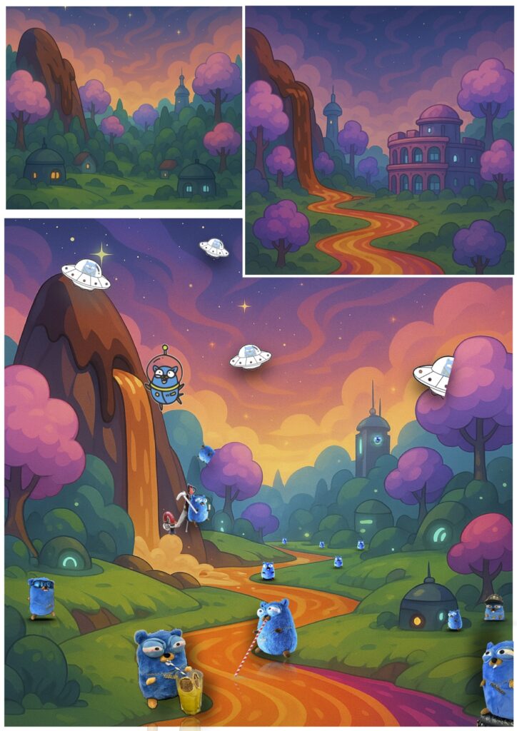 The houses are made of biscuits, cream, and wafers. The inhabitants travel in UFOs shaped like donuts or rocket-spoons. Everything is magical… and repetitive.